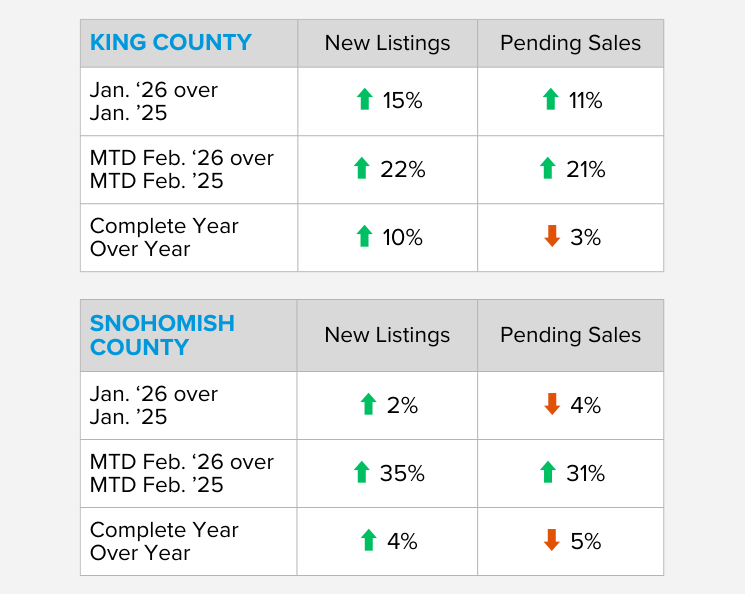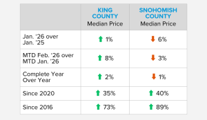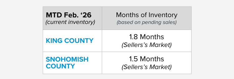 This finds us currently (MTD February 2026) in a Seller’s Market based on pending sales (0-2 Months of Inventory) in both King and Snohomish counties after only being 45 days into 2026. We calculate Months of Inventory by dividing the number of pending sales by the number of available homes for sale to determine how quickly we’d run out of inventory if no new homes came to market based on pending sales demand. We have not been at this level since April 2025 and spent the remainder of 2025 in a balanced market, so this is a marked improvement.