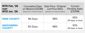 The most current data above for both King and Snohomish counties shows the Cumulative Days on Market (CDOM) for the current pending sales that were accepted since January 1, 2026; more than half quickly came off the market in two weeks or less! This is a stark difference from the CDOM for closed sales in January 2026, which most likely went pending (contract accepted) in late Q4 2025. The market is waking up to the New Year with vigor and excitement for well-prepared, appropriately priced homes.