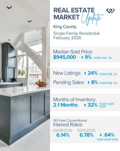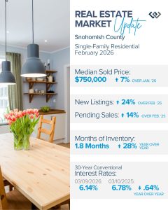 Pending sales in February were also up, showing that buyer demand is absorbing the increase in selection. I’m also happy to report that pending sales month-to-date this March are up compared to February, by 42% in King County and 23% in Snohomish County. This mounting activity is a positive sign for the local real estate market.